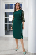 Платье, с центральной двубортной застежкой на пришивные кнопки, с отложным воротником и лацканами. Верхняя часть переда с нагрудными вытачками. Верхняя часть спинки со средним швом и талиевыми вытачками .Нижняя часть переда и спинки расклешенная. Низ переда закладывается в односторонние складки. Шов по талии присборен на резинку. Рукав втачной, короткий, с отложной манжетой. Платье со съемным поясом.