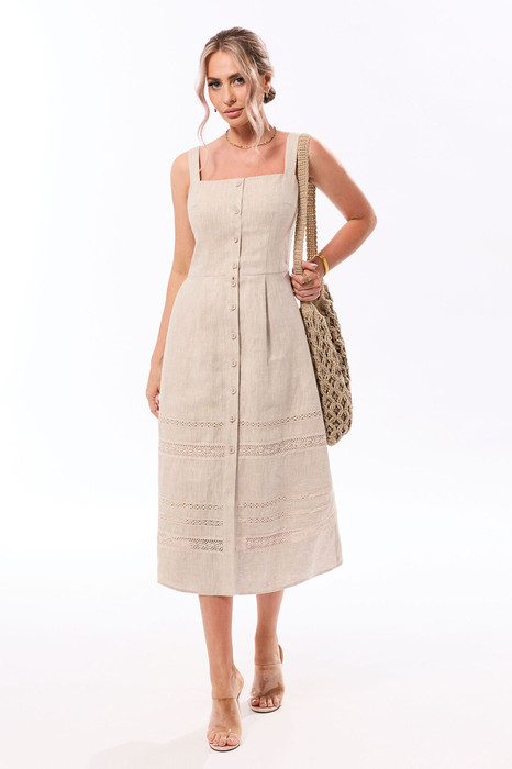 Платье без воротника , с V-образным вырезом горловины. Платье отрезное по линии талии. Полочки лифа переда располагаются на запах, с цельнокроенными завязками. Лиф спинки с талиевыми вытачками. Нижняя часть переда не закреплена к лифу, с центральной застежкой на петли и пуговицы. Шов по талии со стороны спинки присборен на резинку. Рукав втачной, короткий, с отрезной манжетой. Окат и шов притачивания манжеты присборен.