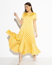 Платье полуприлегающего силуэта, с застежкой на потайную молнию в среднем шве спинки, без воротника, с круглым вырезом горловины. По переду с рельефами, выходящими из проймы. Спинка со средним швом, рельефами, выходящими из проймы. Рукав втачной, длинный, с отрезной манжетой . Из боковых швов и рельефов переда выходят навесные петли, в которые протянут декоративный шнур.