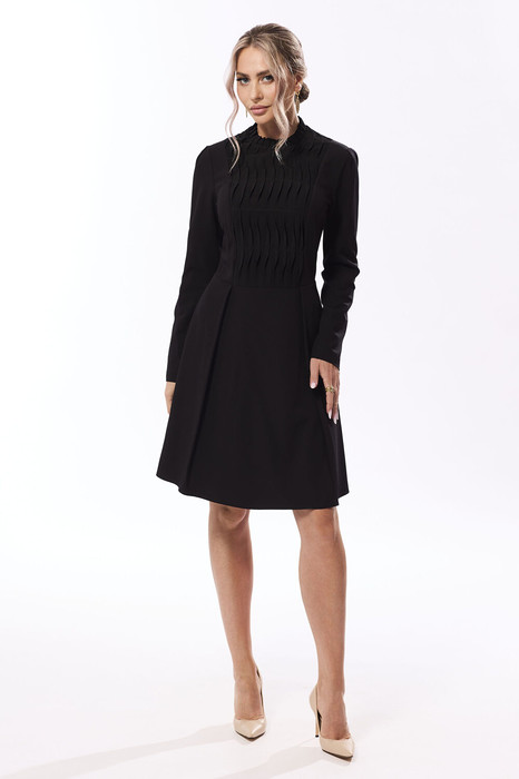 Платье полуприлегающего силуэта, с застежкой на потайную молнию в среднем шве спинки, с отрезным воротником- стойкой, заложенным в односторонние складки. Платье отрезное по линии талии. Верхняя часть переда с рельефами, выходящими из плеча. Центральная часть переда с декоративными защипами .Спинка со средним швом, рельефами, выходящими из плеча. Рукав втачной, длинный. Нижняя часть платья расширенная к низу.