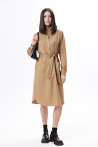 Платье, без воротника, с V-образным вырезом горловины, застежкой на потайную молнию в левом боковом шве. Платье отрезное по линии талии. Лиф переда с деталями на запах, со сборкой по плечевым и нижнему швам. Лиф спинки с частичной сборкой по низу. Рукав длинный, втачной, с отрезной манжетой, присборенной на резинку. Окат рукава со сборкой. Нижняя часть платья с двумя рельефными швами. Нижняя часть спинки со средним швом, двумя рельефными швами.