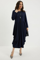 Платье с центральной застежкой на петли и пуговицы, без воротника, с V-образным вырезом горловины. По переду с нагрудными вытачками. Спинка со средним швом, талиевыми вытачками. Рукав втачной, короткий. Платье со съемным поясом.