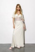 Платье расширенного к низу силуэта, без воротника, с V-образным вырезом горловины, застежкой на потайную молнию в среднем шве спинки. Платье отрезное по линии талии. Лиф переда со средним швом и талиевыми вытачками. Нижняя часть переда с кружевными вставками. . Спинка со средним швом. Верхняя часть спинки с талиевыми вытачками, нижняя часть спинки с рельефными швами. Рукав втачной, короткий, крылышко.