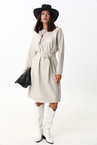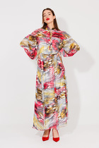 Платье прямого силуэта, свободного кроя, с отрезным воротником- стойкой. Рукав втачной, длинный, с отрезной манжетой. Плечо спущенное. Платье со сьемным поясом.