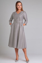 Платье прямого силуэта без воротника с фигурной драпировкой по горловине переда. Перед с нагрудными вытачками. Спинка со средним швом, застежкой на потайную молнию в среднем шве спинки. Рукав втачной, длинный, со складками по окату. Платье со съемным поясом.