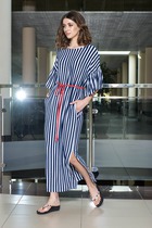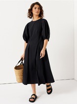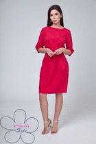 Платье без воротника, с центральной застежкой на петли и пуговицы, с круглым вырезом горловины. Платье отрезное по линии талии. Верхняя часть переда с нагрудными и талиевыми вытачками. Верхняя часть спинки со средним швом, талиевыми вытачками. Нижняя часть платья расклешенная. В боковых швах расположены карманы. Рукав втачной, длинный. По окату рукав присборен.