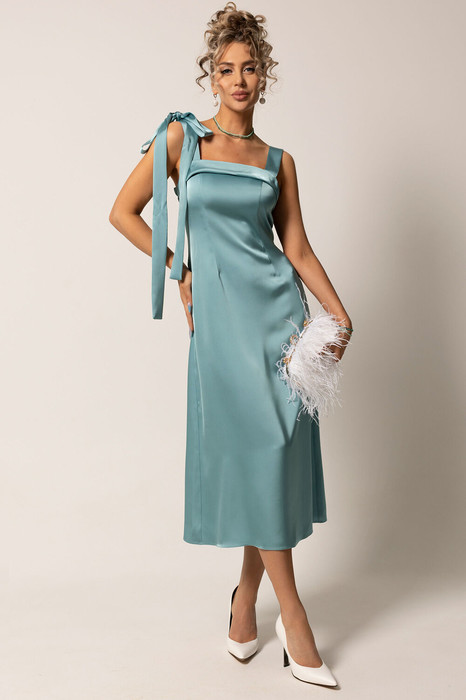 Платье без воротника, на бретелях- завязках , застежкой на потайную молнию в среднем шве спинки. По переду с нагрудными вытачками. По спинке- со средним швом, талиевыми вытачками. Вырез спинки-V-образный. Планка спинки присборена на резинку.