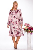 Платье без воротника, на бретелях- завязках , застежкой на потайную молнию в среднем шве спинки. По переду с нагрудными вытачками. По спинке- со средним швом, талиевыми вытачками. Вырез спинки-V-образный. Планка спинки присборена на резинку.