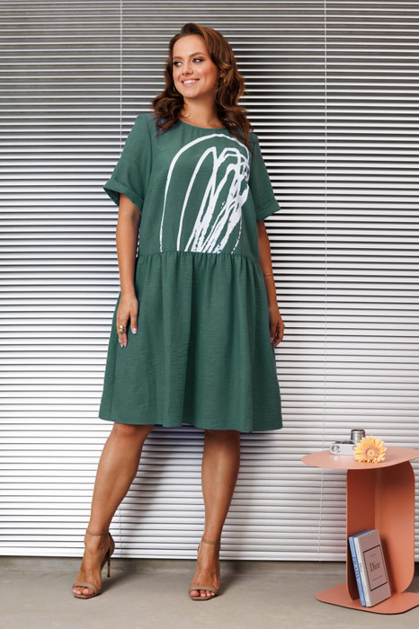 Платье женское свободного силуэта, вырез горловины округлый, рукав втачной с манжетой. Ниже линии талии подрез со сборкой, в боковых швах карманы. По спинке капля и застежка по горловине на петлю-пуговицу. Декором платья является принт по лифу переда. Длина рукава – 26см, ширина плеча – 10см. Длина изделия - 100см.