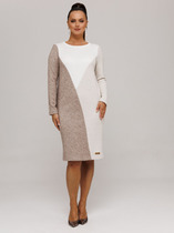 Платье Женское полуприлегающего силуэта, выполнено из фактурного трикотажа. Вырез горловины округлый, рукав втачной до локтя, выполненный из декоративной ткани в виде перьев. По боковым швам отрезные бочки для лучшего приталивания, застежка на тесьму-молнию в среднем шве спинки, по низу разрез. В комплекте сьемная брошь-цветок.