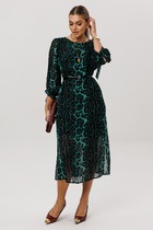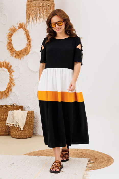 Платье свободного силуэта, вырез горловины округлый. Рукав втачной с декоративным элементом в виде прорези с тесьмой. В боковых швах карманы. Изделие без застежки и без подкладки.
