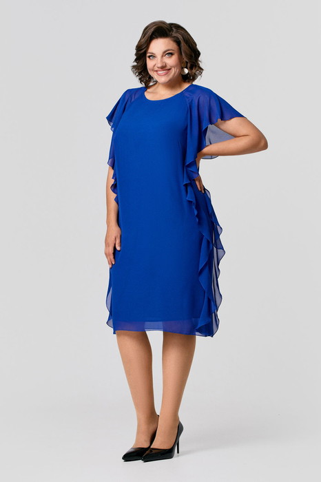 Платье женское прямого силуэта из легкой шифоновой ткани на подкладке из трикотажного полотна с антистатическим эффектом; рукава реглан, переходящие в декоративные воланы по переду и спинке.                                                                                                              Рекомендована стирка при t не выше 30 С, глажение при t  прессующей поверхности не выше 110 С. Длина 103 см.
