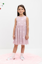 Платье для девочки А-образного силуэта, средней длины, с длинными втачными рукавами, с круглым вырезом горловины, отрезное по линии талии. Перед расшит пайетками. Юбка платья двухслойная, верхний слой юбки из сетки присборен.