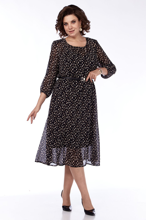 Платье женское, выполнено из легкой плательной ткани, А-силуэта. Горловина округлой формы с драпировкой по переду, обработана окантовкой. Перед с фигурными рельефами выходящими из проймы до низа. Спинка со средним швом в котором имеется застежка на навесную петлю с пуговицей. Рукава втачные, одношовные по низу собраны на эластичную тесьму. Платье на съемной подкладке. Прилагается декоративный ремень.