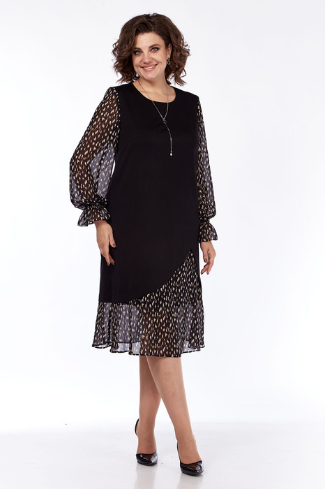 Платье женское комбинированное, выполнено из трикотажного полотна и шифона, А-образного силуэта. По переду имеются нагрудные вытачки, низ платья с фигурным ассиметричным подрезом и притачным воланом. Спинка со средним швом. Рукава втачные, присборены на резинку венгерку. Платье дополнено съемным кулоном. Кулон может отличатся от фото.
