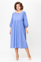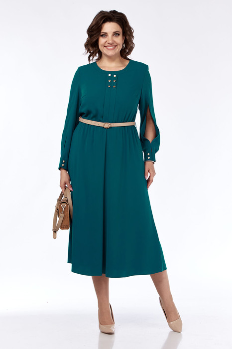 Платье женское, нарядное, А-силуэта, выполнено из плательной ткани. Горловина округлой формы обработана планкой. Платье отрезное по линии талии и собрано на эластичную тесьму. По центру лифа складка декорированная пуговицами. Верхняя часть спинки цельная. Юбка платья 4х-клинка. В боковых швах имеются карманы. Рукава втачные двухшовные по переднему шву разрез, на манжете  с застежкой на две петли с пуговицами. Платье дополнено съемным ремнем.