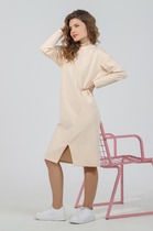 Платье женское, свободного силуэта, выполнено из вискозной ткани с эффектом мятости. Платье с капюшоном, по переду обработаны вытачки и планка с застежкой на петли и пуговицы. Спинка отрезная по линии талии, со сборкой в нижней части. Рукава спущенные с отложными манжетами и патами. В боковых швах обработаны карманы и разрезы. Платье декорировано дизайнерской печатью и нашивкой по низу переда.