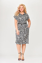 Платье женское прямого силуэта, выполнено из трикотажного полотна. Горловина обработана воротником стойкой, застежка планка на петли и пуговицы. В боковых швах обработаны карманы, по низу шлицы. Рукава спущенные, длинные внизу на манжетах.