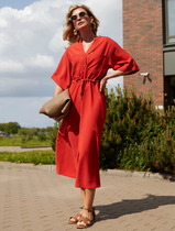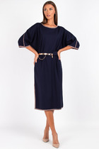 "Платье женское прямого силуэта, изготовлено из натуральной ткани. Горловина круглой формы. По переду обработаны нагрудные вытачки. На спинке средний шов. В боковых швах обработаны карманы, внизу разрезы. Рукава втачные, разрезные с фигурным вырезом. Платье декорировано дизайнерской вышивкой.