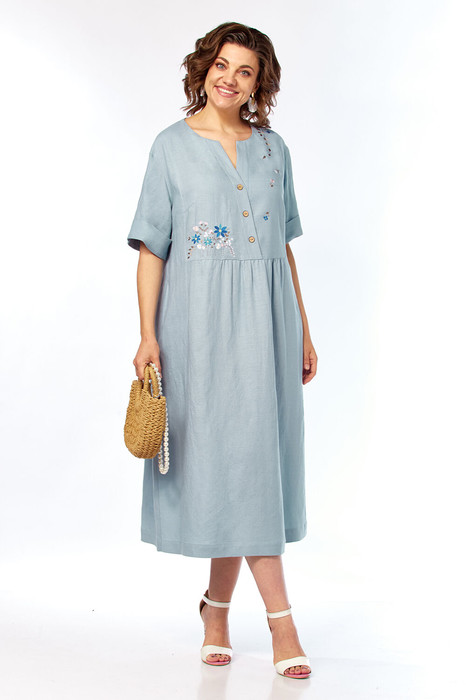 Платье женское, свободного силуэта выполнено из натуральной ткани. Горловина фигурной формы. Платье отрезное по линии талии и слегка присобрано. В верхней части переда обработана имитация застежки на запах. Линия плеча слегка спущена. Рукава с отложными манжетами. В боковых швах обработаны карманы. Изделие дополнено дизайнерской вышивкой.