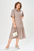 Платье женское, прямого силуэта из плательной ткани. Горловина оформлена воротником и планками, декорированными пуговицами. Платье отрезное по талии с кулисой. Обработаны накладные карманы. Рукав спущенный с отложной манжетой. По спинке кокетка, переходящая на перед. На юбке платья средний шов. В боковых швах разрезы. Платье декорировано отделочной тесьмой и шнуром в цвет тесьмы.