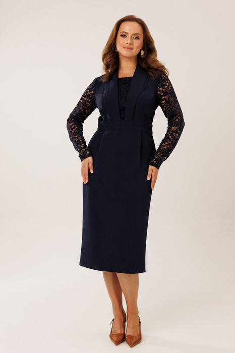 Платье женское нарядное полуприлегающего силуэта. Платье отрезное по линии талии. На полочке располагаются отрезные рельефные швы и центральная вставки из гипюровой ткани. Спинка платья со средним и рельефными  швами. По переду отрезной юбки заложены 2 складки. По спинке отрезной юбки средний шов со шлицей и 2 вытачками. Горловина платья обработана отрезным воротником шалевого типа.