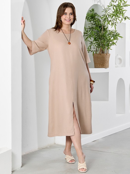 Платье женское из гладкокрашеного тканого полотна, свободное,слегка расширенное к низу, с горловиной овальной формы, короткими втачными рукавами, вытачками в области груди, карманами в боковых швах. Перед состоит из двух частей, в шве соединения деталей по центру разрез, горловина окантована основным материалом.