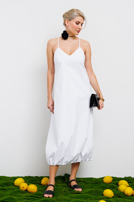 Трендовое платье балон. Внизу вставлена резинка с фиксатором для регулировки обьема. Спинка открытая с тонкими бретелями. Застежка на потайную молнию.