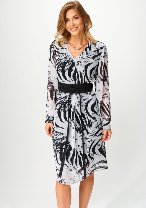 Платье женское, повседневное, на подкладке,свободного силуэта, расширенное книзу, длиной ниже коленей, с втачными рукавами, со съемным поясом. Вырез горловины детали переда платья «V-образной» формы, по центру обработана складка. По плечевым швам обработана сборка. Рукава втачные одношовные, с притачными манжетами, с застежкой на 2  петли и 2 пуговицы. Разрезы обработаны окантовкой, по швам притачивания обработана сборка.                                            Платье: длина рукава  - 61см, ширина рукава – 21см, длина спинки – 107см.