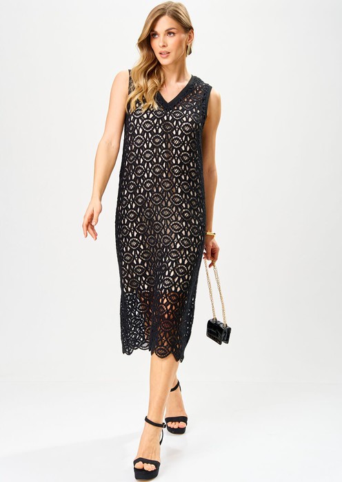 Платье женское, двухслойное, состоящее из хлопкового верхнего и нижнего поливискозного слоя. Верхнее - из кружевной ткани, полуприлегающего силуэта, зауженное книзу, длиной до середины икр. Вырез горловины платья «V-образной» формы, с втачной бейкой из отделочной ткани. Проймы обработаны втачной бейкой из отделочной ткани. Нижнее платье на бретелях с регуляторами. Деталь переда с нагрудными вытачками. Платье (верхнее): длина плеча – 7,5см, длина спинки – 99,5см. Платье (нижнее): длина спинки – 73см.