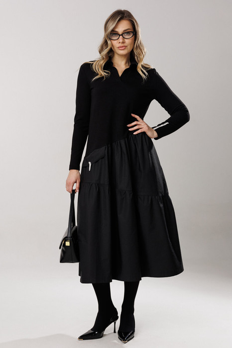 Восхитительное платье свободного А-силуэта с ассиметричным отрезным уклоном по линии талии и притачивания воланов юбки изделия, горловиной в стиле поло. Полочка и спинка платья отрезные по линии талии с ассиметричным уклоном. Верх изделия из трикотажного полотна. Спереди расположены горизонтальные нагрудные вытачки. Горловина платья оформлена V-образным вырезом с заходящими планками и отложным воротником со стойкой, в стиле поло. Глубина выреза 13-14 см. Ширина планок 3 см. Рукав прямой, одношовный, втачной. Линия плеча чуть спущена на 1,5 см. Длина рукава 59-60 см. Длина изделия по спинке 124,126 см (в зависимости от размерного ряда). Декоративным элементом выступает контрастная тесьма, расположенная вертикально по центру линии спинки лифа платья и фрагментарно на одном из рукавов изделия. Юбка платья А-силуэта состоит из двух составных воланов под уклоном на умеренной сборке. На линии соединения талии с юбкой платья с одной стороны переда втачена нефункциональная деталь-клапан. В боковом шве юбки изделия расположен внутренний карман. Длина платья по спинке 124-126 см (в зависимости от размерного ряда).