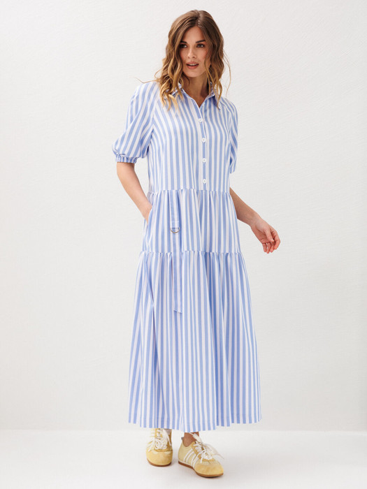 Восхитительное платье свободного силуэта с отрезной линией талии, рукавом реглан укороченной длины. Полочка и спинка платья отрезные по линии талии. Спереди расположены горизонтальные нагрудные вытачки и фронтально-вертикальная бортовая застежка на петли/пуговицы. Рукав покроя реглан, длиной 3/4. Низ рукава собран на эластичную тесьму (резинку). Длина рукава совместно с плечевым швом 56 см. При желании рукав можно приподнять выше линии локтя (фиксируется на эластичной тесьме). Горловина платья оформлена отложным рубашечным воротником на стойке. Юбка платья А-силуэта, состоит из двух ярусных воланов на умеренной сборке. На линии соединения талии с юбкой платья с одной стороны переда втачена декоративная деталь: удлиненная пата с полукольцом. В боковых швах расположены внутренние карманы. Длина платья по спинке до линии соединения с юбкой 40-41 см. Общая длина платья по спинке 123-125 см (в зависимости от размерного ряда).