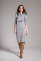 Платье женское без подкладки, полуприлегающего силуэта длиной выше колена. Вырез горловины круглый. По переду средний шов, талиевые вытачки и прорезные функциональные карманы с листочкой. Спинка со средним швом и талиевыми вытачками. Застежка на потайную тесьму-молнию в среднем шве спинки. Рукава длинные с  разрезом по низу переходящим в складку, который украшен красивыми  пуговицами с камнями.