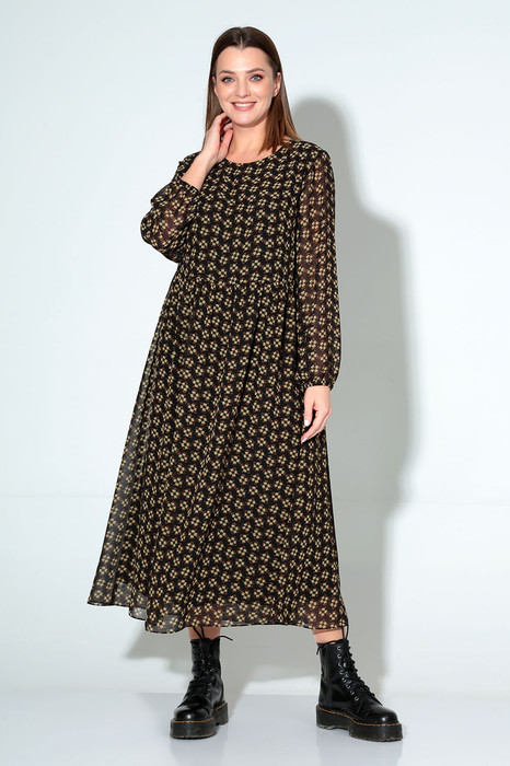 Шифоновое платье свободного силуэта на трикотажной подкладке. Горловина овальной формы. Платье отрезное чуть выше линии талии, на сборке. Рукав втачной. Низ рукава собран на эластичную тесьму