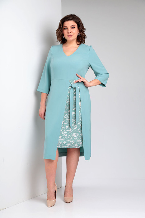 Платье полуприлегающего силуэта, по переду отрезное по линии талии. Верхняя часть переда с нагрудными рельефами и с V-образным вырезом горловины обработанной обтачкой. Нижняя часть переда с высоким разрезом и вставкой из шифона на трикотажной подкладке. Спинка со средним швом, в который вставлена потайная молния, и таллиевыми выточками. Рукав втачной 3/4 одно шовный.