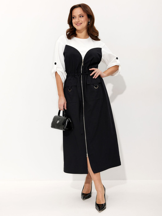 Комфорт - один из ключевых трендов современной действительности, который отлично реализуется в контексте стиля «спорт-кэжуал». Его выбирает тот, кто не желает ограничивать себя жёсткими рамками, стремится выглядеть модно и динамично и не считает, что красота требует жертв. Платье выполнено из двух видов ткани: трикотажа (верхняя часть лифа платья и рукава) и хлопка (нижняя часть лифа платья и юбка).  Платье отрезное по линии талии на кулисе, в которую вставлен пояс-завязка что позволяет регулировать приталивание. По переду платья от проймы вставлена декоративная молния с двумя бегунками, что позволяет регулировать высоту разреза. Спереди накладные карманы с клапаном и патой декорированной металлическим полукольцом. Спущенная линия плеча. Низ рукава поддерживается декоративной патой на петлю и пуговицу.