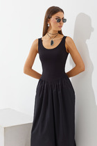 Платье с округлым вырезом горловины, отрезное ниже линии талии и сборкой от неё. Перед с двумя рельефами от горловины до боковых швов и карманами в них. Спинка с потайной молнией в среднем шве и талиевыми вытачками до отрезной детали ниже линии талии. По низу платья идёт волан со сборкой. Рукава втачные. Изделие на подкладке.