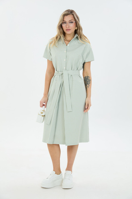 Платье прямого силуэта, длиной ниже колена, со спущенной линией плеча и рукавами на основе цельнокроеного. Спинка и перед с горизонтальной кокеткой. Застежка спереди на планку и петли-пуговицы. Воротник рубашечный на стойке. По линии бёдер диагональный подрез. По переду нижней части платья глубокая складка. Пояс в комплекте.