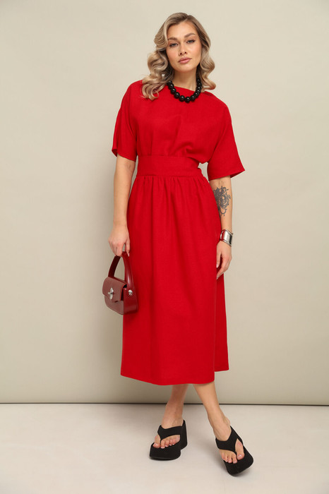Платье длины миди со свободной юбкой и пришивным по переду поясом. Рукав цельнокроеный. По спинке встречные складки и застёжка по линии горловины на пуговицу. Длина по спинке 125 см