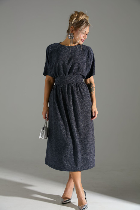 Платье длины миди со свободной юбкой и пришивным по переду поясом. Рукав цельнокроеный. По спинке встречные складки и застёжка по линии горловины на пуговицу.