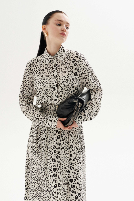 Платье свободного силуэта выполнено из плательной ткани с анималистическим принтом "леопард". Рукав втачной, по низу рукава манжеты на застёжку петлю и пуговицу.  Воротник рубашечного кроя, застёжка до линии талии на петли и пуговицы, по лифу клапаны выше линии груди клапаны. Линия талии отрезная на резинке.  По переду юбки два глубоких запаха, которые фиксируются навесными петли и пуговицами. По лифу спинки кокетка и отрезная линия талии. К платью прилагается съёмный пояс из основной ткани, на резинке, с металлической пряжкой.