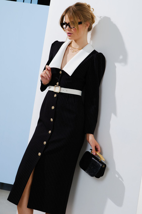 Платье прилегающего силуэта, выполнено из костюмно-плательной ткани дизайн "полоска" на трикотажной подкладке. Рукав втачной, верхняя часть рукава собрана на сборку. По горловине воротник выполнен из отделочной ткани, застёжка центральная на петли и пуговицы.  По переду и спинке для облегания талевые вытачки. Пояс входит в комплектацию модели.
