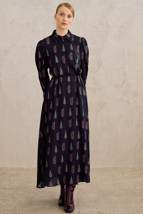 Платье полуприлегающего силуэта, отрезное по талии. Рукав втачной, по низу рукава манжета с застежкой на петли и пуговицы. Воротник рубашечного кроя, по переду
