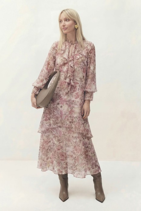 Платье свободного двухпредметное. Верхний слой платья выполнен из шифона. Рукав длинный втачной, по низу рукава резинка, в шов втачивания рукава по переду вставлена рюша. По горловине стойка, собранная на сборку с завязкой. По переду от плеча до линии талии вставлен волан с отлетными концами. По линии талии вставлена кулиса. По низу платья в фигурный подрез вставлен волан.
