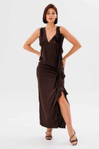 Женственное платье из двух видов ткани создано, чтобы покорять сердца! Интересный вариант на торжественные мероприятия. Рукав втачной, три четверти. По низу изделие украшает декоративная вставка из атласа.