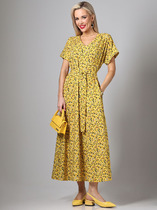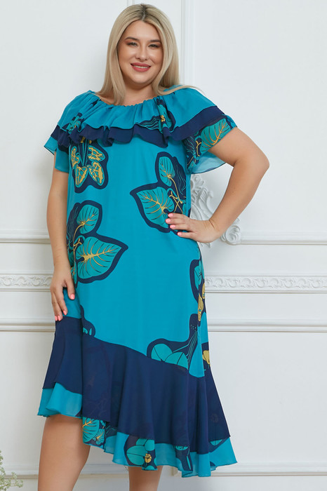 Женственное платье прямого силуэта длиной до линии икр. Модель выполнена из шифона с ярким принтом, на подкладке. Широкий, круглый вырез горловины присобран на резинку и дополнен двойной рюшей. Рукав реглан укороченной длины. Низ изделия, асимметричный с диагональным подрезом, оформлен также как горловина, широкой двойной рюшей. Легкое платье поможет создать интересный нежный образ.