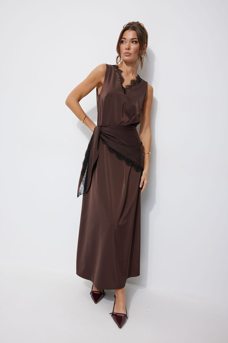 Нарядное платье из струящейся ткани, длина макси. Платье свободного кроя, прямое, расширенное к низу. С глубоким V-образным вырезом горловины по переду и спинке, декорированным французским кружевом. По переду нагрудные вытачки. Без рукава. Платье дополняется платком из основной ткани. Платок декорирован по двум срезам французским кружевом. Обращаем Ваше внимание, что кружево может незначительно отличаться от фото.