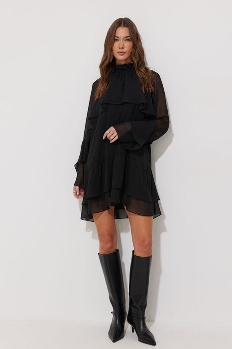 Платье из шифона. Длина мини. Платье расширенного А-силуэта. Воротник-стойка с застежкой по спинке на воздушные петли и металлические пуговицы на ножке. По переду и спинке отлетные кокетки фигурной формы, со сборкой по срезу горловины. По спинке в среднем шве потайная молния. По низу платья два волана со сборкой по верхнему срезу. Рукав реглан, длинный, со сборкой по горловине. По рукаву по спирали вставлен волан. Платье на подкладке. Обращаем Ваше внимание, что фурнитура может незначительно отличаться от фото.
