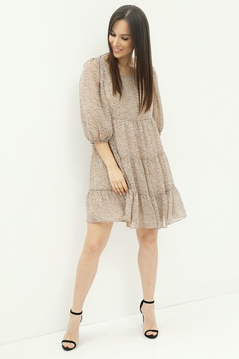 Стильное летящее шифоновое платье A-образного силуэта на подкладке. Рукав втачной, снизу присброен на эастичную тесьму. Талия отрезная, слегка завышена. Длина платья от плечевого шва 91см. Длина рукава 43см.