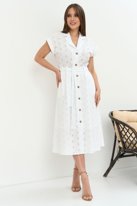 Легкое воздушное платье свободного кроя. Выполнено из натурального хлопкового полотна с вышивкой. Центральная застежка на пришивные пуговицы. Воротник отложной. Рукав цельнокроеный. Платье по талии отрезное. Нижняя часть на подкладке из хлопка. Приталено за счет съемного пояса, выполненного из основной ткани. Длина платья от плечевого шва 121 см.
